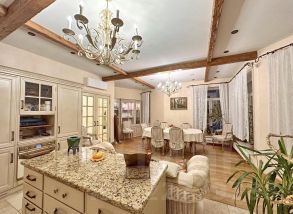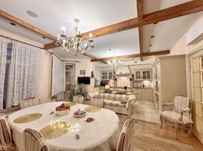 • Просторная кухня-столовая с гарнитуром Arcari из массива дерева и обеденной группой Salda