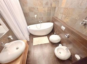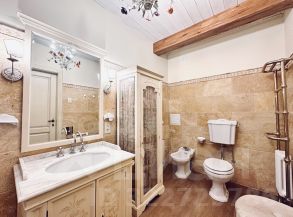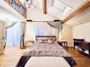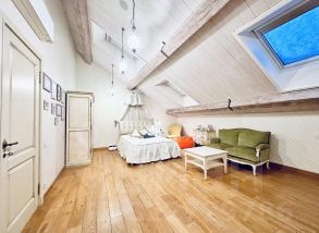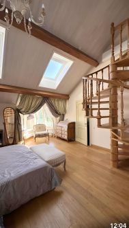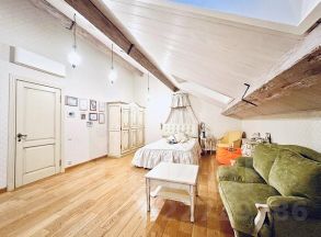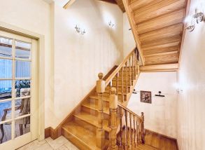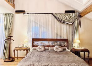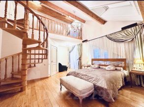 • Мастер-спальня двухуровневая, с деревянной винтовой лестницей, эркером и балконом с живописным видом