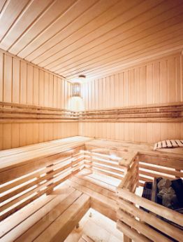 • Сауна с купелью из мозаики, подсветкой, душевой и отдельным санузлом