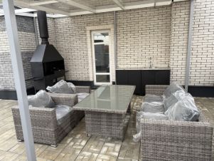 выход на веранду/ зону отдыха на которой мангал и уличная кухня под навесом