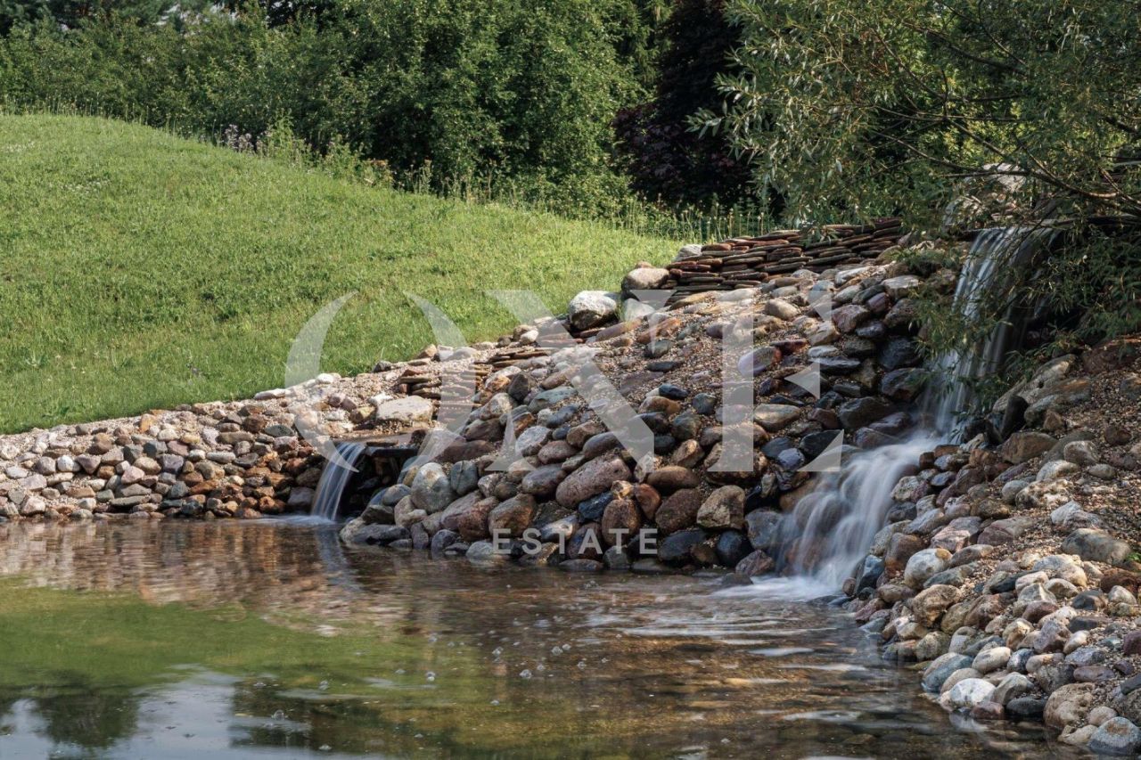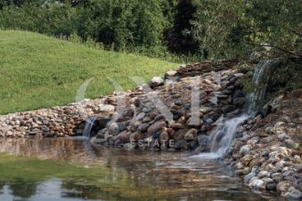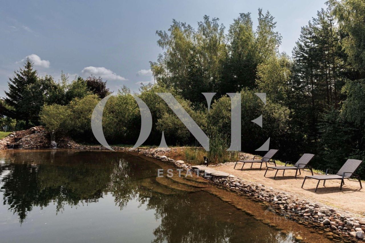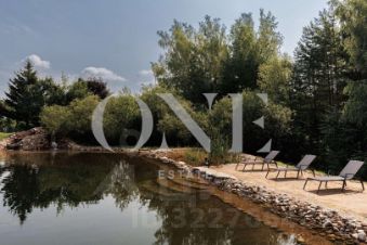 Естественный ландшафтный дизайн участка без строгой симметрии, с акцентом на вековой хвойный лес и реку, создает ощущение простора. На территории обустроены пруд, пляж, баня, зона отдыха и барбекю, крытое парковочное место для двух автомобилей. Объект 54546-7969.