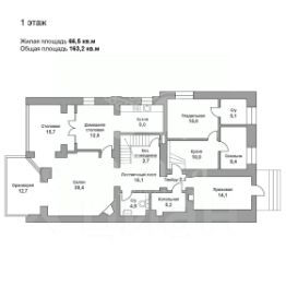 1 этаж: прихожая, гардеробная, с/у, гостиная-столовая, столовая с выходом на террасу, кухня, котельная и блок для прислуги.