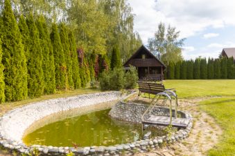 Большой участок с живой изгородью из туй и гортензий. Растут взрослые Сибирские кедры, сосны, березы. Красивый газон. Есть пруд-бассейн. Мангальная беседка.
