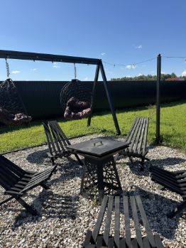 — на участке лобное место с очагом и качели с 2 коконами, есть мангальная зона с обеденной зоной