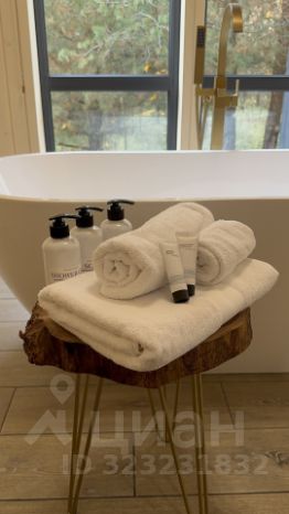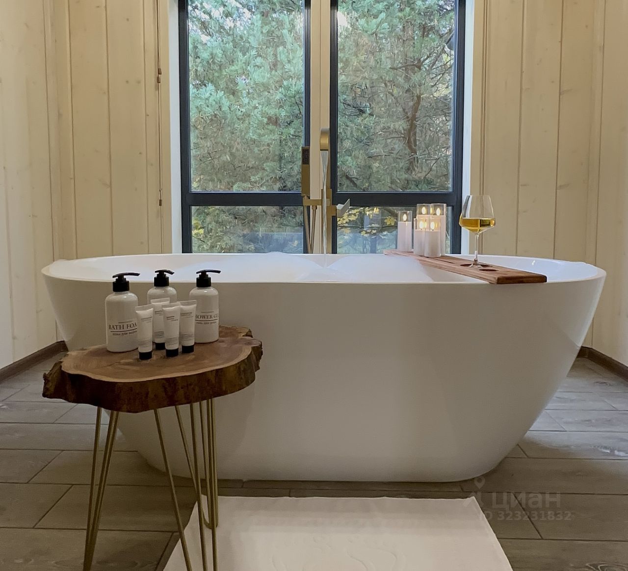 Дом оснащен 2-мя санузлами, в одном из которых находится ванная с панорамным видом на лес, а в другом комфортный душ с обливной системой ливень, так же есть все банные принадлежности - фен, зубная паста, шампуни, гели для душа, мыло, ватные диски и палочки.