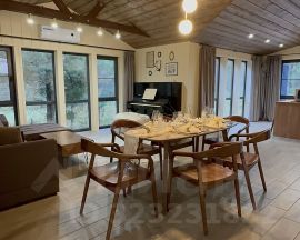 Дом 150 кв. м. с сауной (входит в стоимость) и купелью (оплачивается отдельно), расположен на лесном участке площадью 0,6 Га , участок огорожен со всех сторон, что делает пребывание безопасным как для детей так и для домашних питомцев.