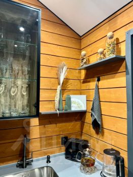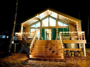 Стены дома выполнены из имитации бруса и выкрашены в благородный цвет, что создает ощущение тепла и уюта. Из панорамных окон гостиной открывается потрясающий вид на лес, а высокие потолки дают ощущение простора. Особенностью дома является система отопления, проложенная по полу, благодаря чему в холодные зимние дни комфортно даже босиком.
