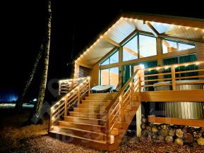 Пространство большой полуоткрытой террасы в любую погоду располагает к чтению любимой книги на свежем воздухе или чашечке утреннего кофе под пение птиц. На террасе предусмотрена купель с подстветкой и гидромассажем. На участке оборудованы мангальная и костровая зоны для уютных вечеров под открытым небом.