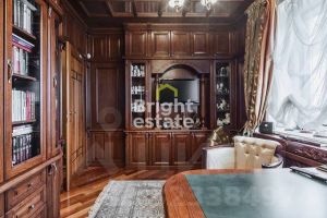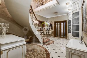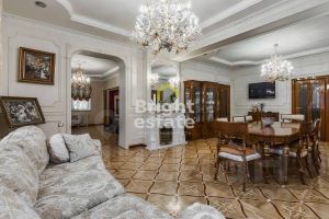 Интерьеры дома выдержаны в духе элегантной классики. Каждое помещение наполнено светом, теплом и утончённой роскошью. Полы выполнены из ценных пород дерева, художественный паркет переливается мягким блеском, двери изготовлены из массива, а лепнина создана вручную мастерами. Центральным элементом гостиной стал антикварный камин XVIII века — подлинное произведение искусства, которое задаёт тон всему интерьеру. Мебель выполнена на заказ и идеально сочетается с натуральной палитрой отделки, создавая уютную, благородную атмосферу.