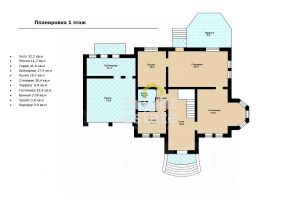 На первом этаже — просторный холл, гостиная, столовая и кухня, объединённые в единое пространство для жизни и приёма гостей, а также гостевая спальня, санузел, постирочная, котельная и гараж.