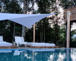 Большая сауна с видом на бассейн — сразу можно нырнуть в теплую воду!