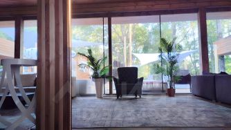 Огрoмныe пaнopамные окна с видом на сосны и бассейн