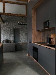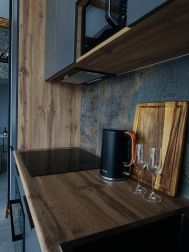 Полностью оборудования кухня с плитой; холодильником; микроволновой печью;