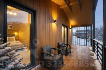 • Спальная комната с панорамными окнами и выходом на веранду и видом на лес