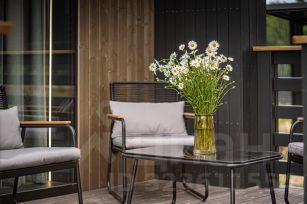Первый этаж встречает коридором, откуда можно попасть в первую спальную комнату и санузел. Далее расположена просторная гостиная с панорамным остеклением и верандой, наполняя интерьер солнечным светом и открывая вид на живописные пейзажи. Здесь вас ждет роскошная итальянская диванная группа в стиле contemporary, которая легко трансформируется в дополнительное спальное место идеально для друзей или младших членов семьи.