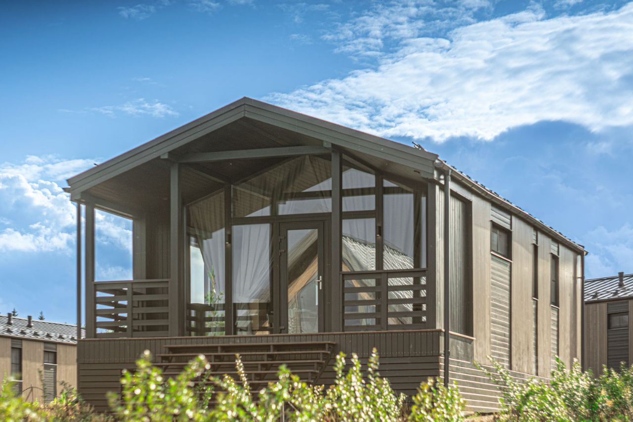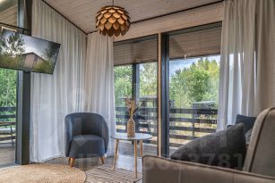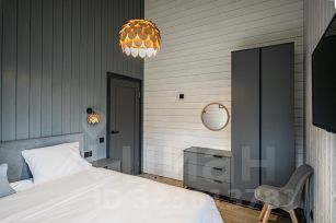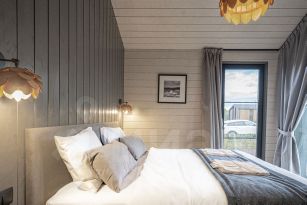 главная спальня с кроватью DBL, где утро начинается с солнечных бликов на деревянных стенах;