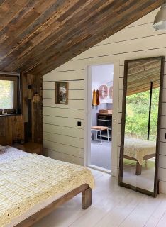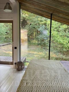Спальня с панорамными окнами, выходящими на прилесной участок