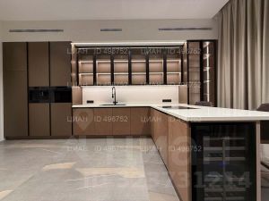 Кухня с встроенной бытовой техникой: посудомоечной машиной, холодильником, духовым шкафом, винным шкафом, микроволновой печью, варочной панелью, кофемашиной. Бытовая техника ASKO. Кухонный остров оборудован варочной панелью со встроенной вытяжкой.
