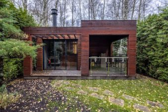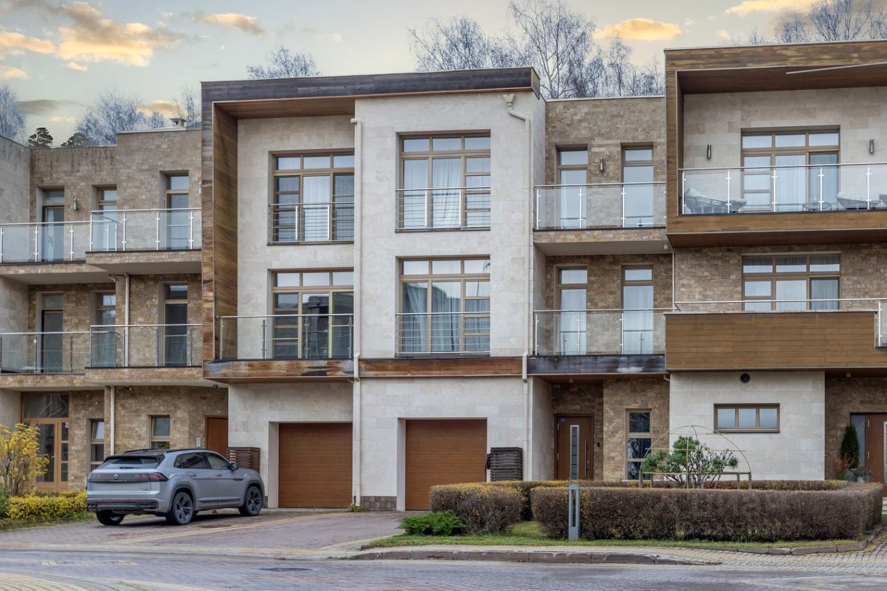 На первом этаже: прихожая со встроенным гардеробом, гостевой санузел, гостиная с дровяным камином, кухня, столовая с выходом на террасу в приватную часть участка, постирочная со стиральной и сушильной машинами, кладовая для хранения под лестницей, котельная с установленной системой водоподготовки. С фасадной части таунхауса вход в пространство для хранения инвентаря, покрышек и при необходимости парковки мотоцикла.