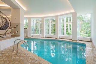 бассейн 9х3,8х1,5 с противотоком , 30 градусов. Шикарный вид из бассейна на лес.