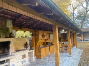 Большая чайная беседка из дерева — отличное место для отдыха летом и зимой.