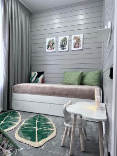 Детская комната с выдвижной кроватью 80*200 с возможностью увеличить спальное место до 160*200, а также есть детская кровать-манеж для детей от 0 до 3 лет и детский стульчик для кормления.