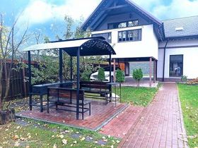 В банном комплексе - русская баня, теплый бассейн, 3 спальни с двуспальными кроватями, диван в гостиной раскладывается на 2 спальных места. 2 санузла, 1 душевая