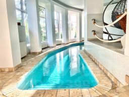 бассейн 9х3,8х1,5 с противотоком , 30 градусов. Шикарный вид из бассейна на лес.