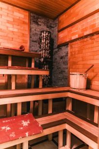 -Зона отдыха в банном комплексе с шезлонгами, подвесными креслами и стол.