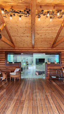 Отдeльнo стoящaя, отапливаемая камином беседка, с зоной барбекю, казаном, грилем и коптильней, телевизором и микрофонами для караоке, переносной колонкой, стробоскопом со своей брусчатой площадкой для танцев, которая трансформируется в костровую зону с костровым очагом по центру.