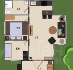 Внутри комфортная гостиная, совмещенная с кухней, две отдельные комнаты и полноценная ванная с душем. Дом оформлен в приятном современном стиле, создающем атмосферу спокойствия и домашнего уюта.