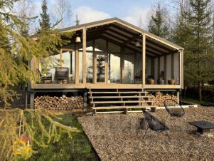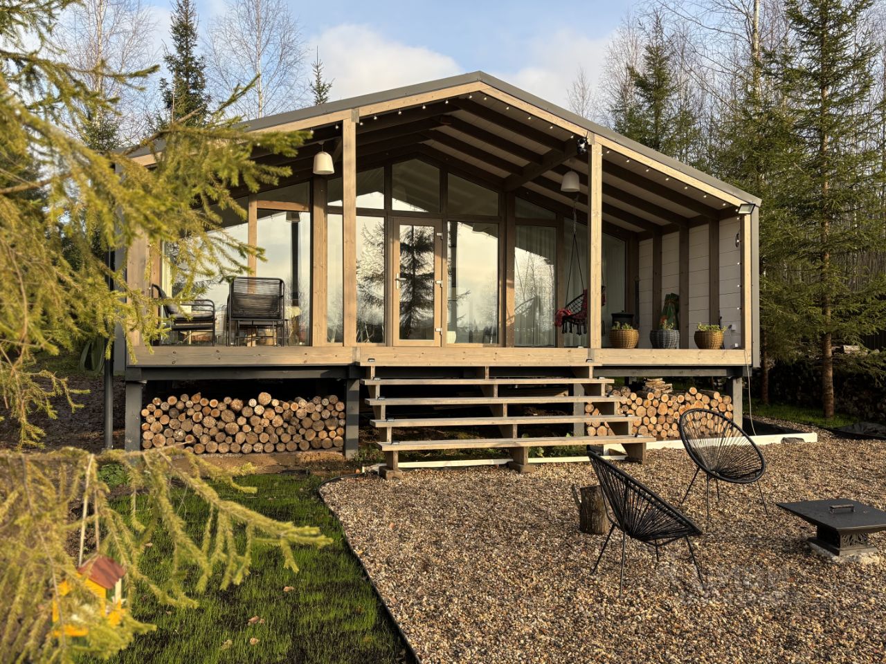 Современный Дом Барн с панорамными окнами и видом на зеленый участок с елями