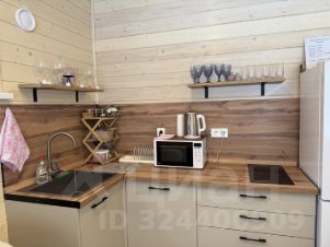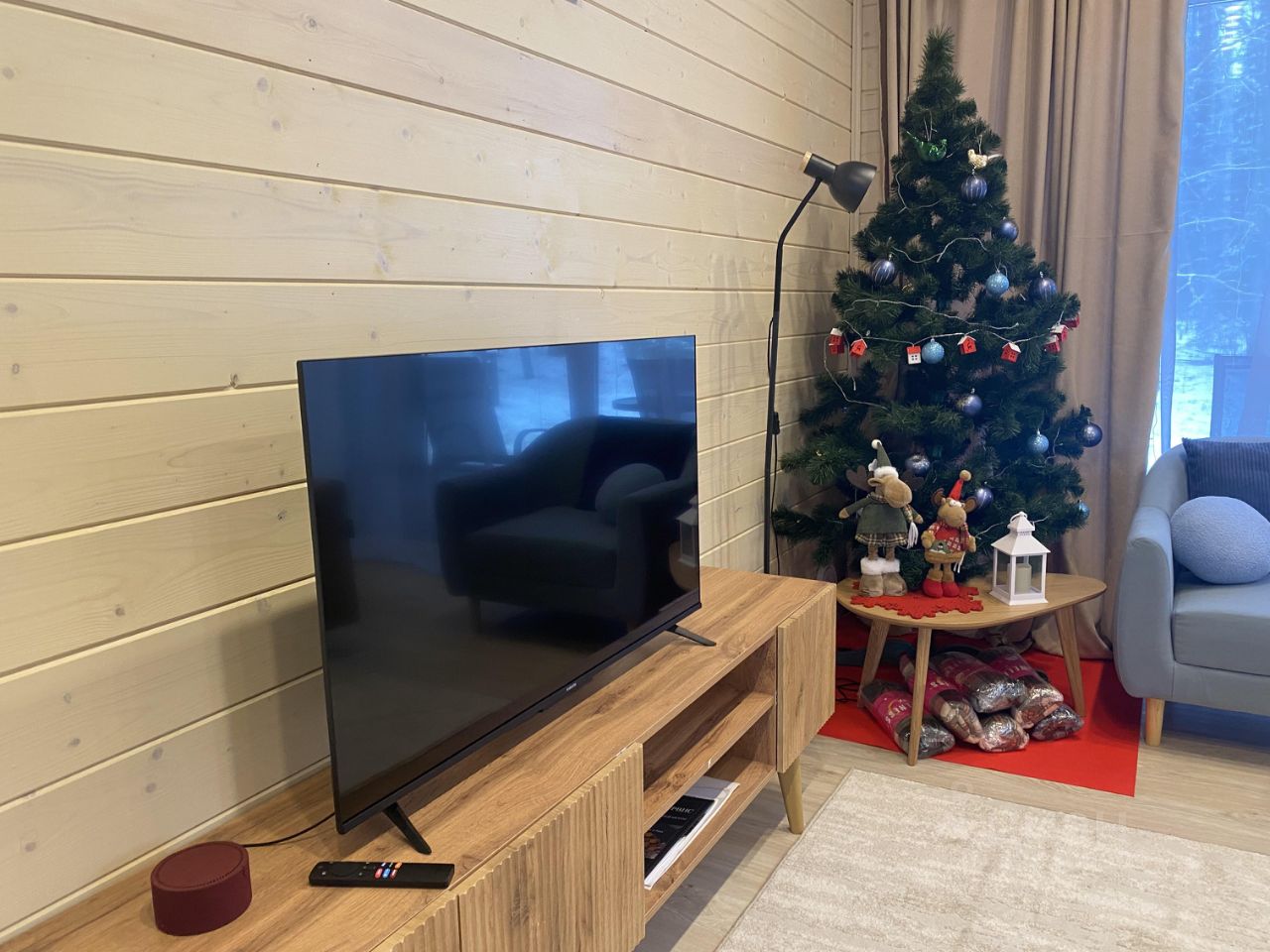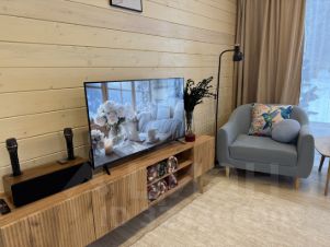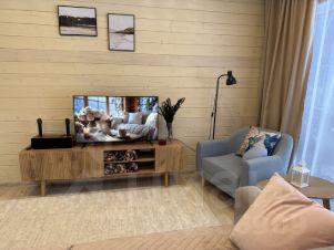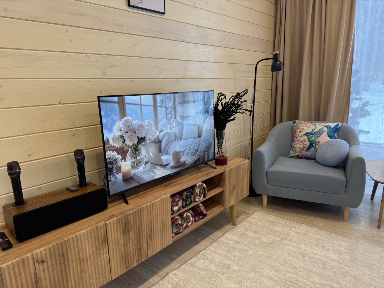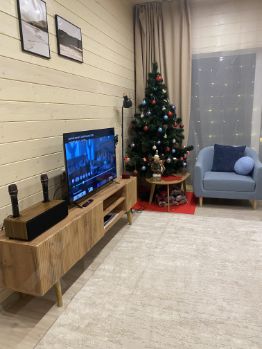 Кухня-гостиная с большим телевизором и раскладывающимся диваном,колонкой Алиса и караоке системой.