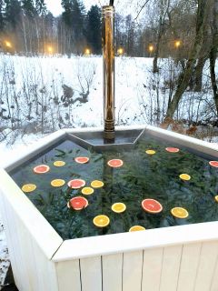 Собственная русская баня и чан фурако на дровах с видом на лес.