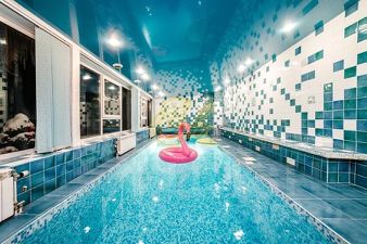 большой бассейн 8х2,60 м глубиной около 1,70 м с панорамными окнами. Музыкальная колонка и надувные круги и матрасы для безудержного веселья в бассейне.