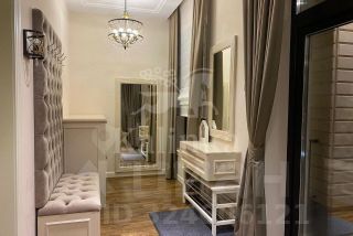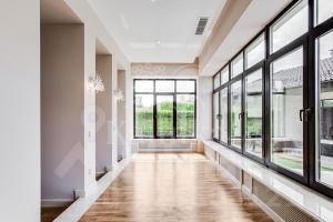 Гараж на 2 авто со входом в дом расположен на первом этаже. Вокруг дома уложен ухоженный газон, через который проложены дорожки с декоративным освещением. Густые деревья, высаженные по периметру участка, скрывают его от взглядов посторонних. Особняк возведен по монолитной технологии из кирпича, отличается прочностью и долговечностью.