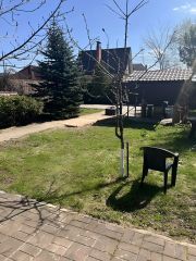 Садовые качели. Парковочные места до 4 машин внутри двора. Рядом есть большая детская площадка.