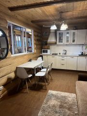 Кухня-гостинная с ТV, диваном и небольшим столом, кухонный гарнитур с плитой и посудомойкой, микроволновка, холодильник, электрочайник, кофеварка на капсулах, вся необходимая посуда, казан на 10л.