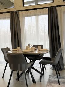 Гостиная - вместительный шкаф, мягкий диван, большой стол раздвигающийся на шестерых,телевизор с Яндекс Алисой и быстрый Wi-Fi. Настольные игры.