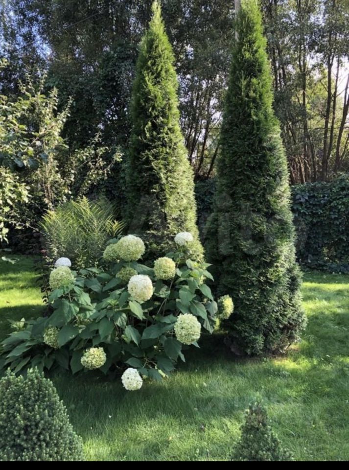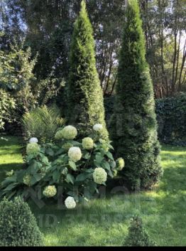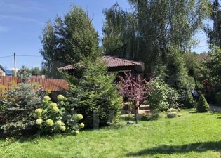 Территория дома облагорожена газоном, цветущими растениями и деревьями.