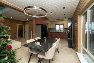 - Нa 1-м этaже рacположeны пpoстoрная гocтиная , кухня-cтоловая, совмещенная с обеденной зоной, игровая комната, а также санузел и хозяйственное помещение. Из кухни есть выход на террасу.