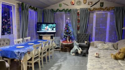 На участке 40 соток, построена большая всесезонная деревянная горка, длина скольжения 25 м, с красивым освещением. По всему участку развешенные гирлянды. Для катания с горки есть два больших тюбинга и ледянка. Рядом мини-футбольное поле с газоном, в зимнее время заливается каток. Есть хоккейные ворота и оградительные бортики с сеткой за воротами 10/ 3 м. Большая беседка с кирпичной печью барбекью, где можно пожарить шашлыки или приготовить другие блюда на огне, стол с креслами на 8 гостей. Детская площадка для малышей с качелями и горкой,большой профессиональной батут 4 м в окружении берёз, все очень уютно и красиво. Есть костровая чаша, можно погреться у открытого огня. Имеется навес под машину, вторую можно поставить у ворот. .Участок очень красивый, есть всё для отдыха как детей, так и взрослых.