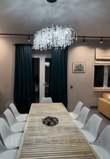 - большая кухня-гостиная (50 м²) с ТВ зоной, диваном, кухонным гарнитуром, необходимой техникой и большим обеденным столом на 12 человек