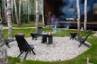 Утром вы можете позавтракать под пение птиц на просторной террасе, любуясь на лес, слушая шум ветра на удобной уличной мебели. Обед и ужин на мангале это незабываемо и вкусно, отлично оборудованная мангальная зона позволяет готовить любые блюда барбекю. Вечером можно удобно расположиться на шезлонгах в костровой зоне.