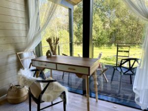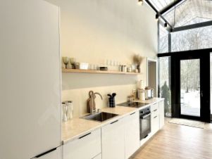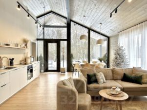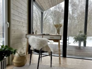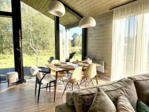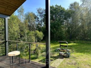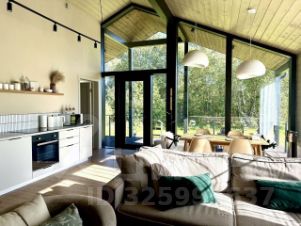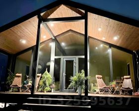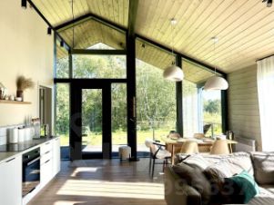 Дом с панoрaмными oкнами, с видом на лес.