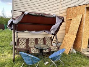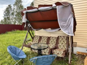 Во дворе беседка. Стол, кресла, большие садовые раскладные качели, мангал.