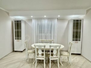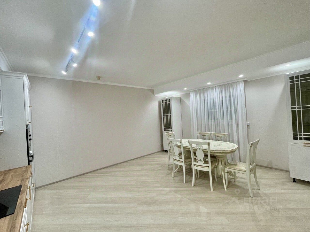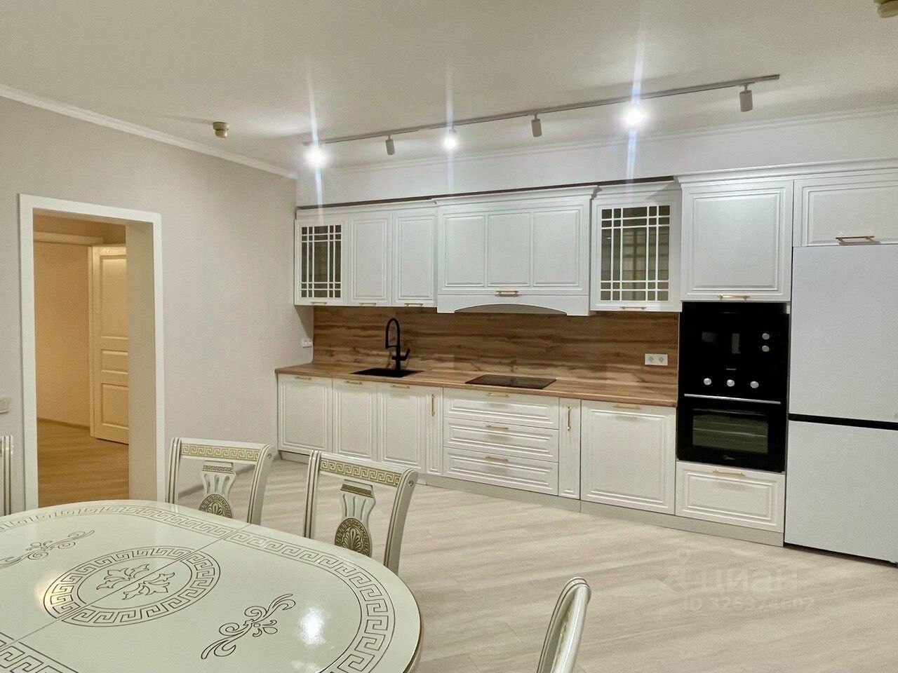 Встроенный кухонный гарнитур с бытовой техникой (холодильник, посудомоечная машина, духовка, СВЧ), обеденный стол.