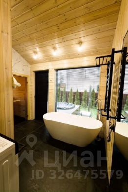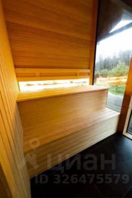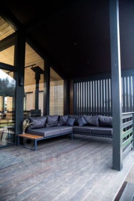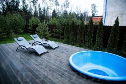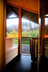 Из сауны выход на террасу в горячий чан и зону отдыха с шезлонгами
