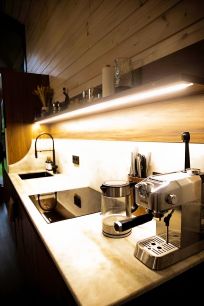 Вся необходимая техника: посудомоечная машина, индукционная плита на 4 конфорки, микроволновка, духовой шкаф, электрический чайник, рожковая кофемашина, фен, утюг