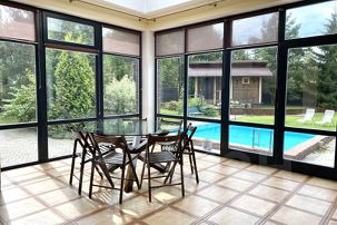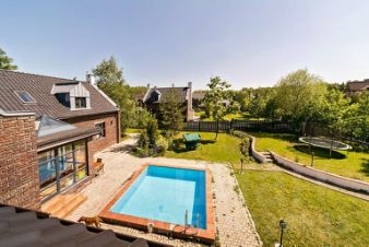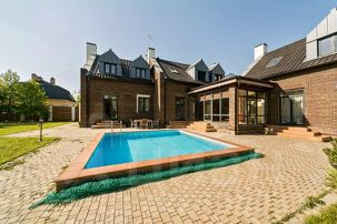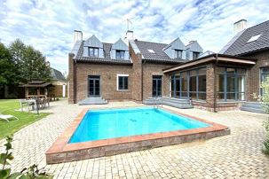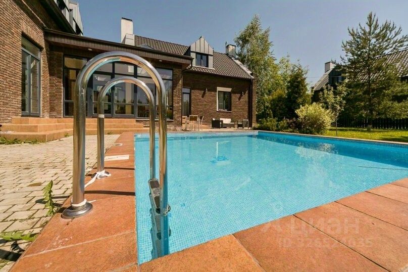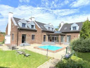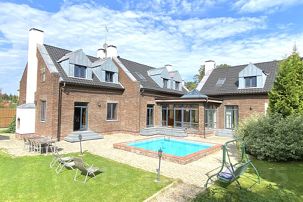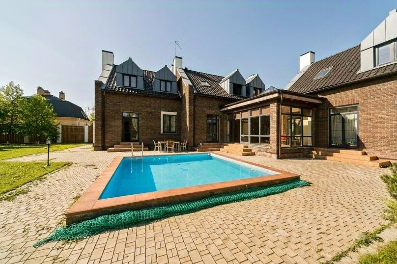 Коттедж окружен ухоженной территорией, где расположены открытый бассейн, работающий с мая по ноябрь, а также зоны для активного отдыха. На территории есть футбольное поле и детская площадка, что делает это место идеальным для семейных мероприятий.